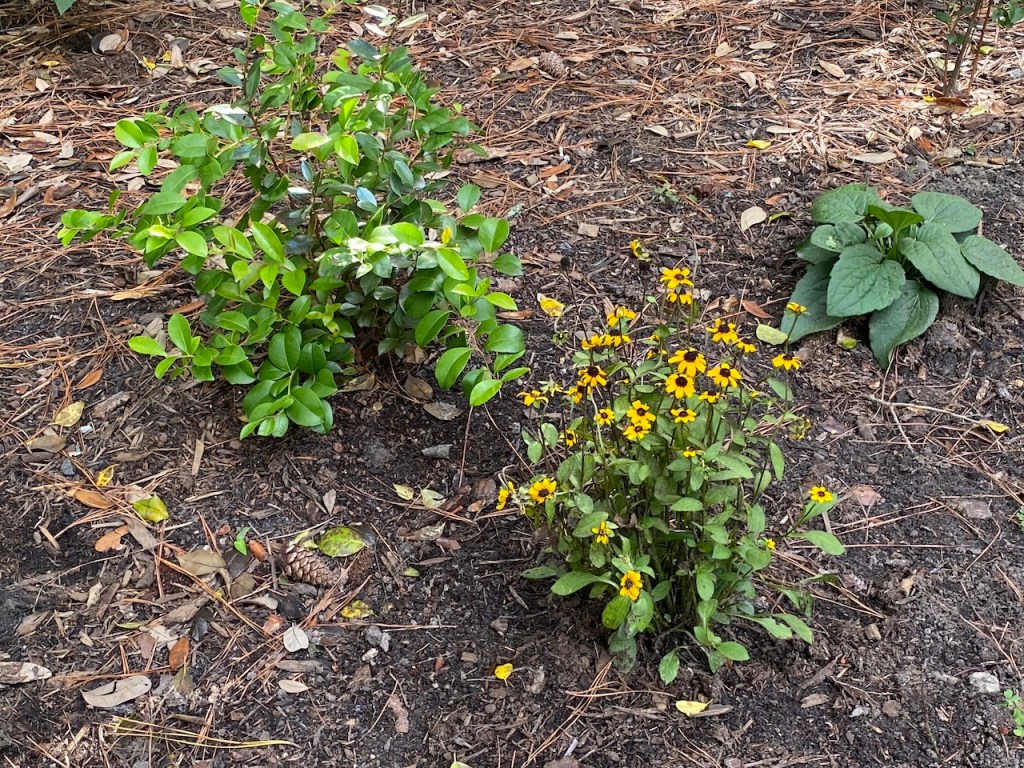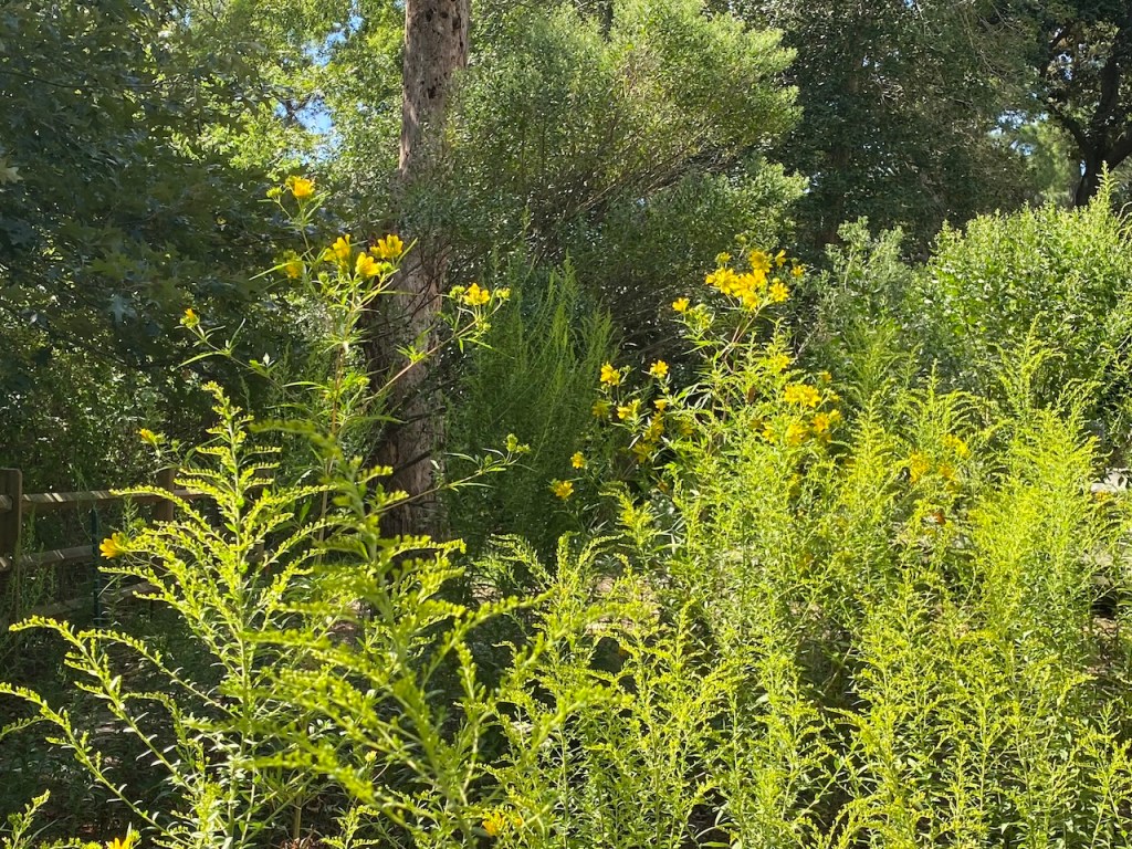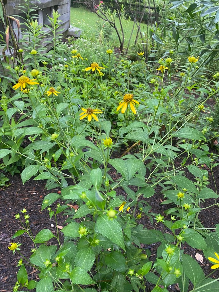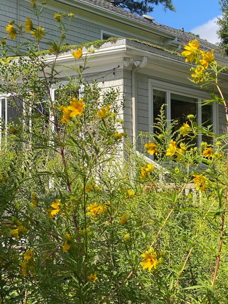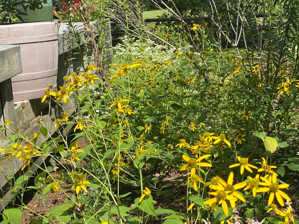This is a few of the plants blooming in the summer. The goldenrod is gorgeous, especially mixed with the bearded beggartick (also tall yellow flowers) that I got from a neighbor. Click on any photo to see a bigger image.